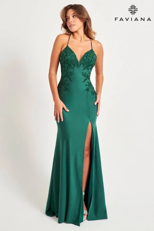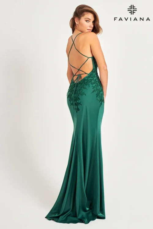 Satin fitted gown with a high slit and low open lace up back with lace appliqué details