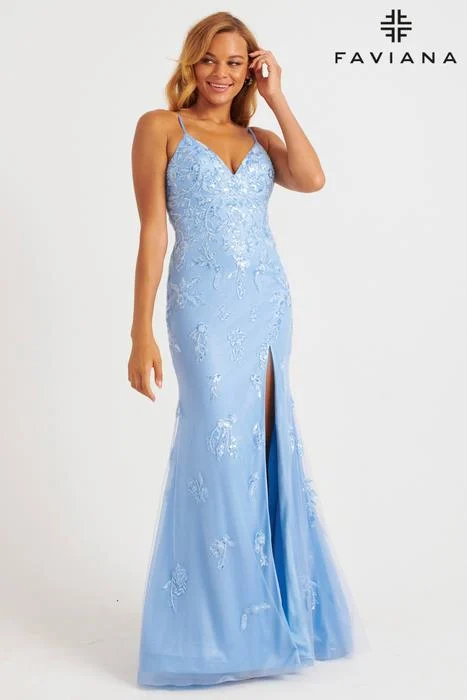 V neck fitted gown with an open back and thigh high slit with beaded appliqués