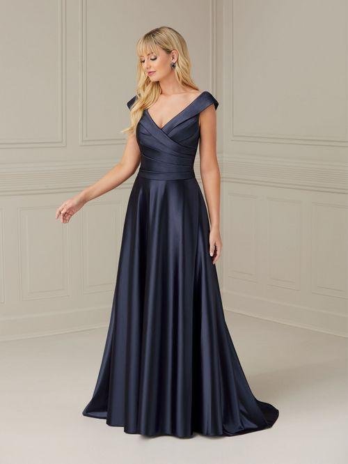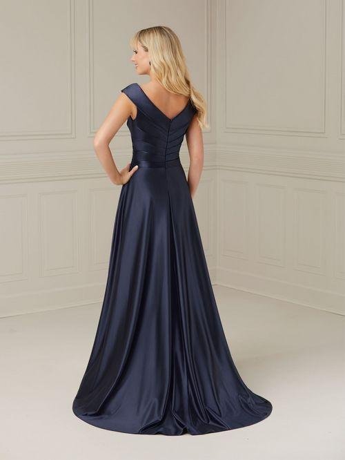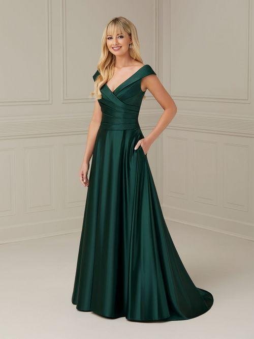 V-neckline with a pleated bodice, overlap A-line skirt has side pockets and center zipper with sweep