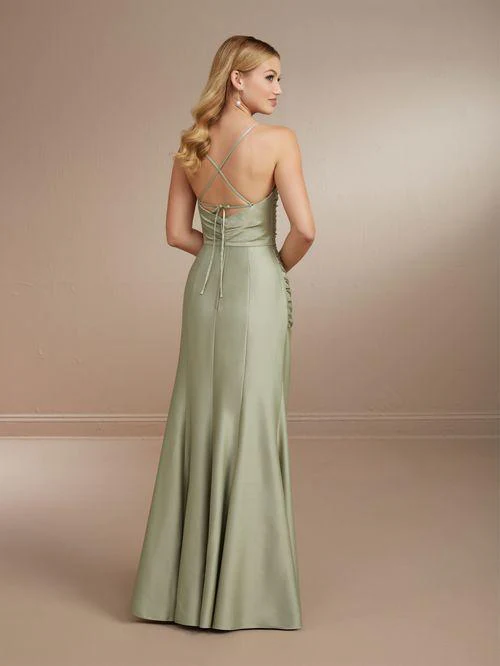Fitted rouched charmeuse bridesmaids dress with a low back and spagetti straps that tie in a bow