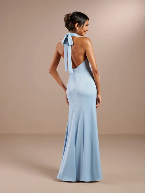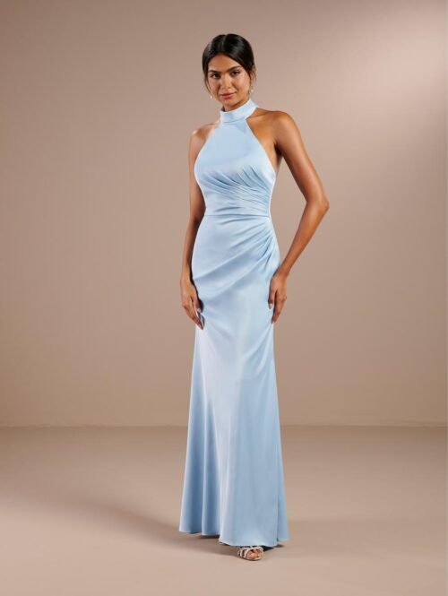 Halter neck matte charmeuse fitted gown with rouching down the front of the dress and a low back