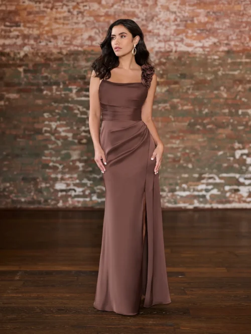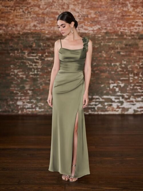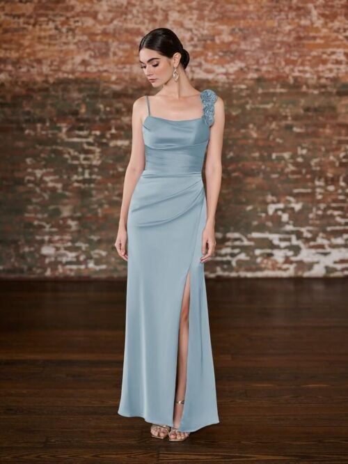 Elegant square neckline gown with a rouched skirt and asymmetrical 3D rose strap