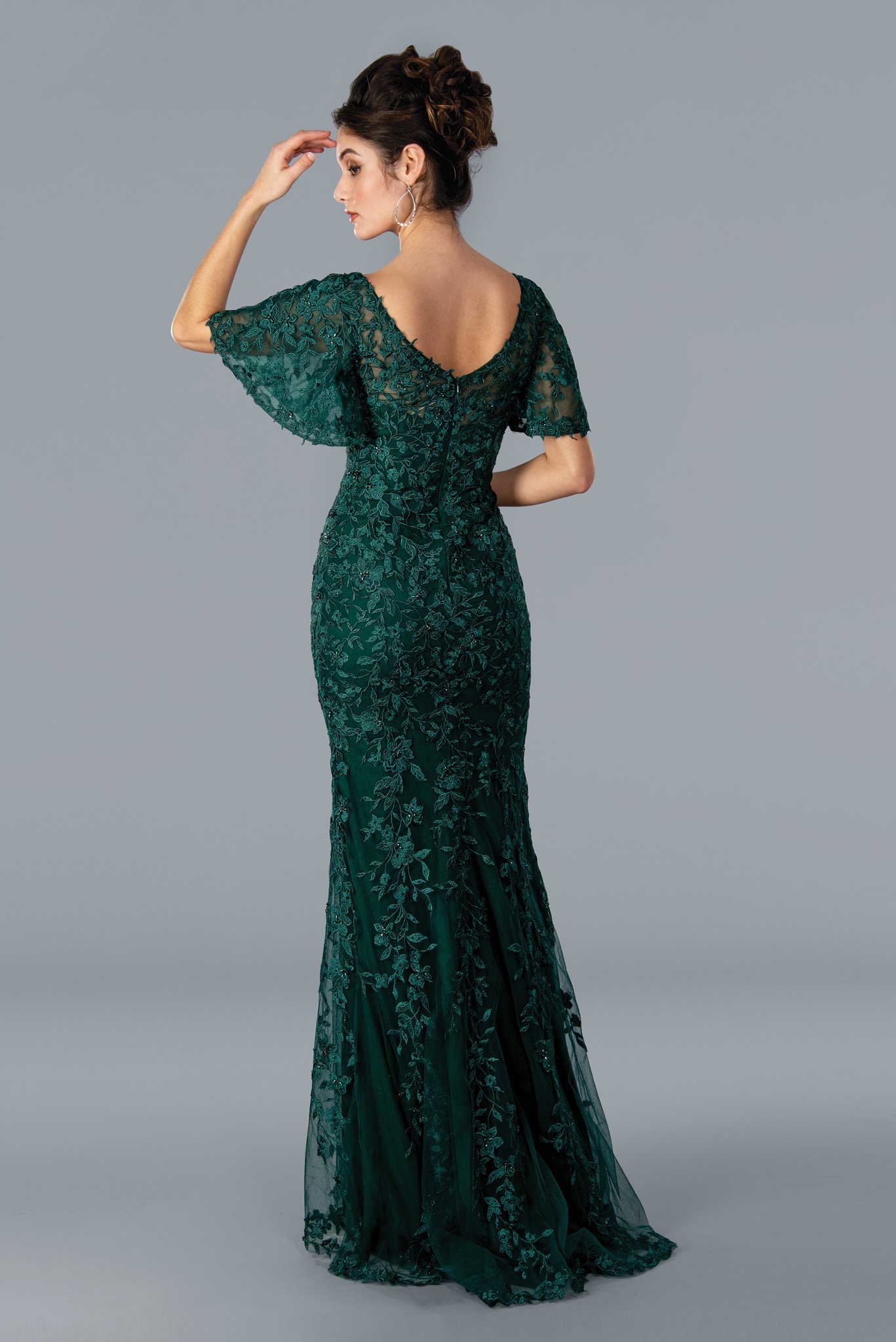 All over lace sheath gown with a v neckline and lace flutter sleeves