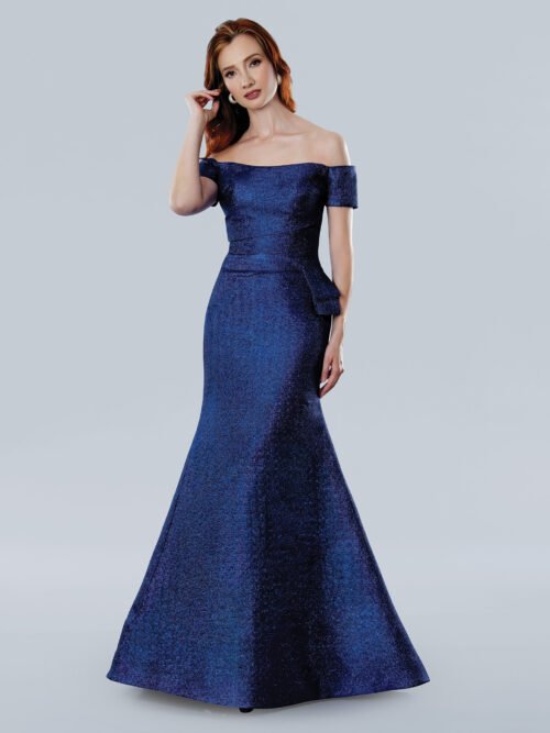 Elegant straight neck off the shoulder mermaid fit gown with a roughed bodice and a side peplum