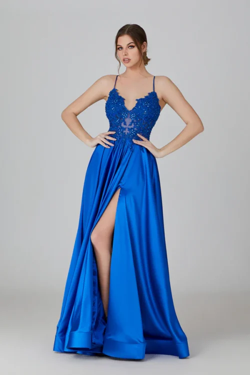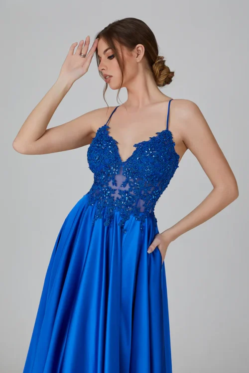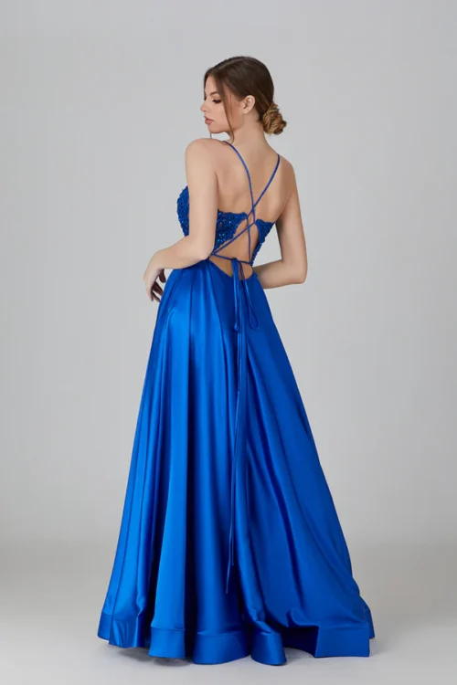 Soft satin a-line gown with a beaded sheer lace bodice with a Strappy open back