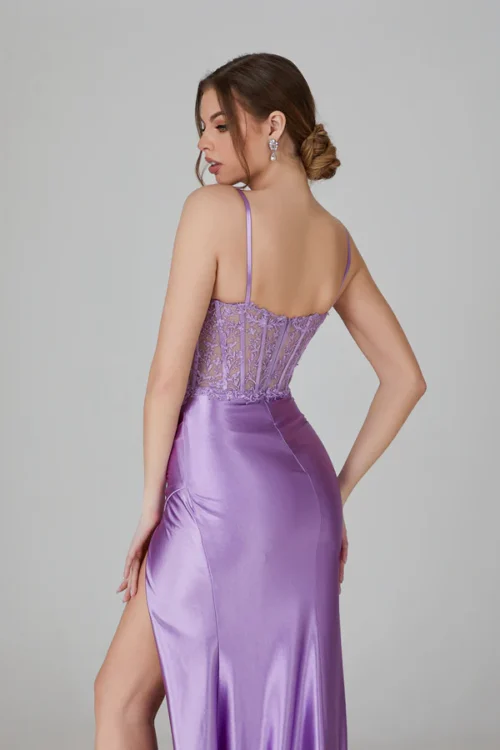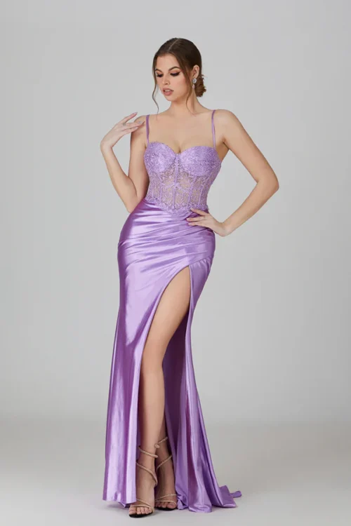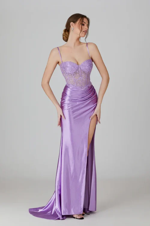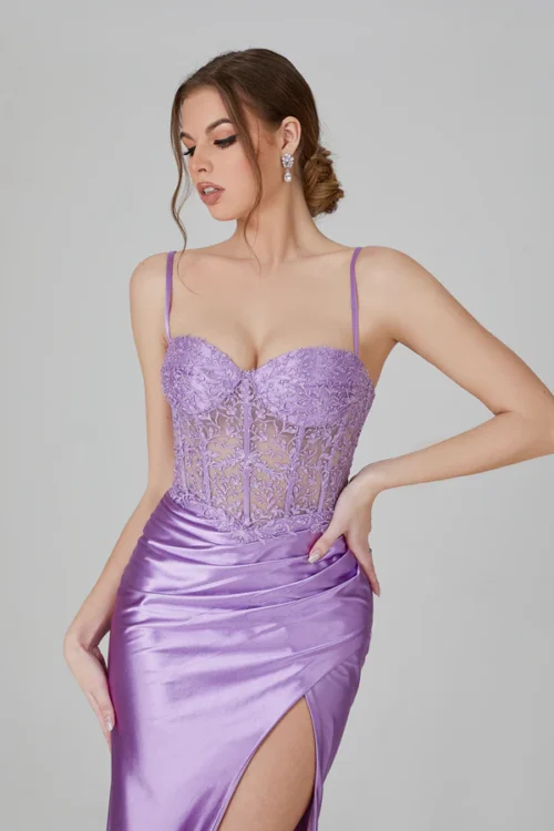 Fitted gown with lace bustier style corset top and draped stretch satin skirt