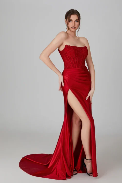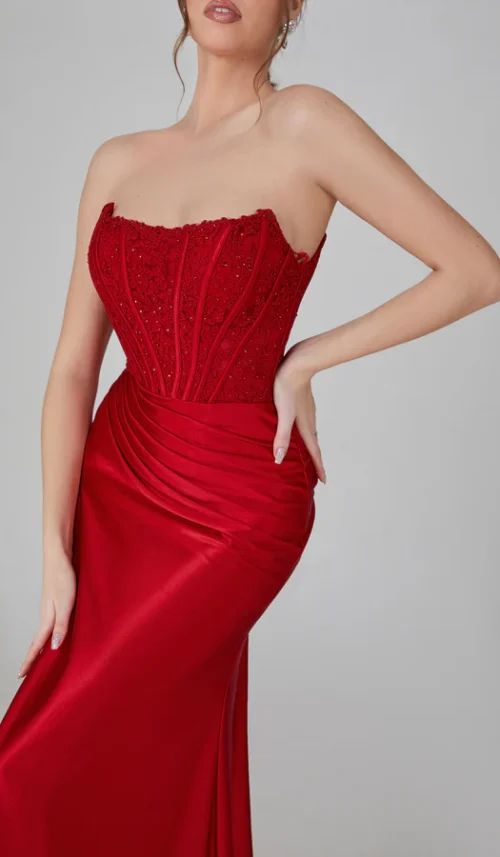 Fitted gown with a structured scoop neck corset bodice with defined waist and ruched satin skirt