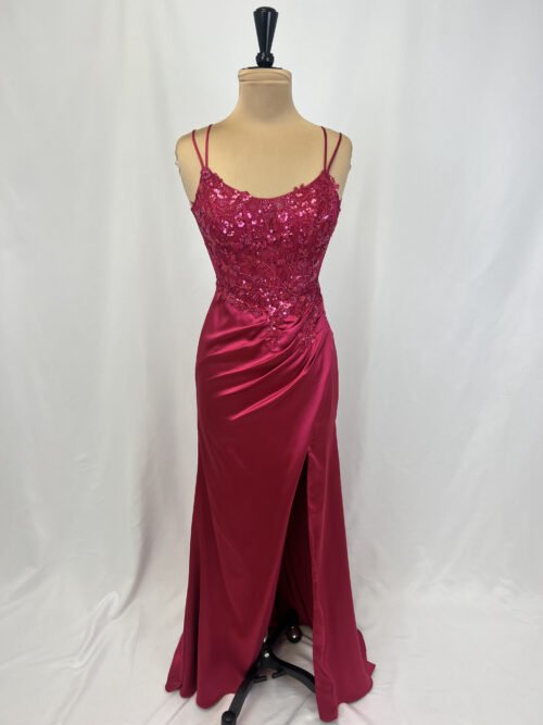 A bold evening gown with sequin embellishments, a draped satin skirt, and a crisscross lace-up back