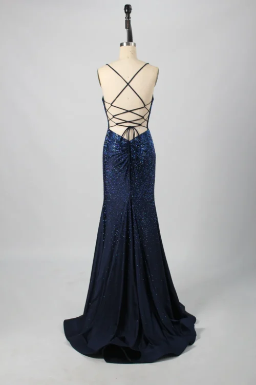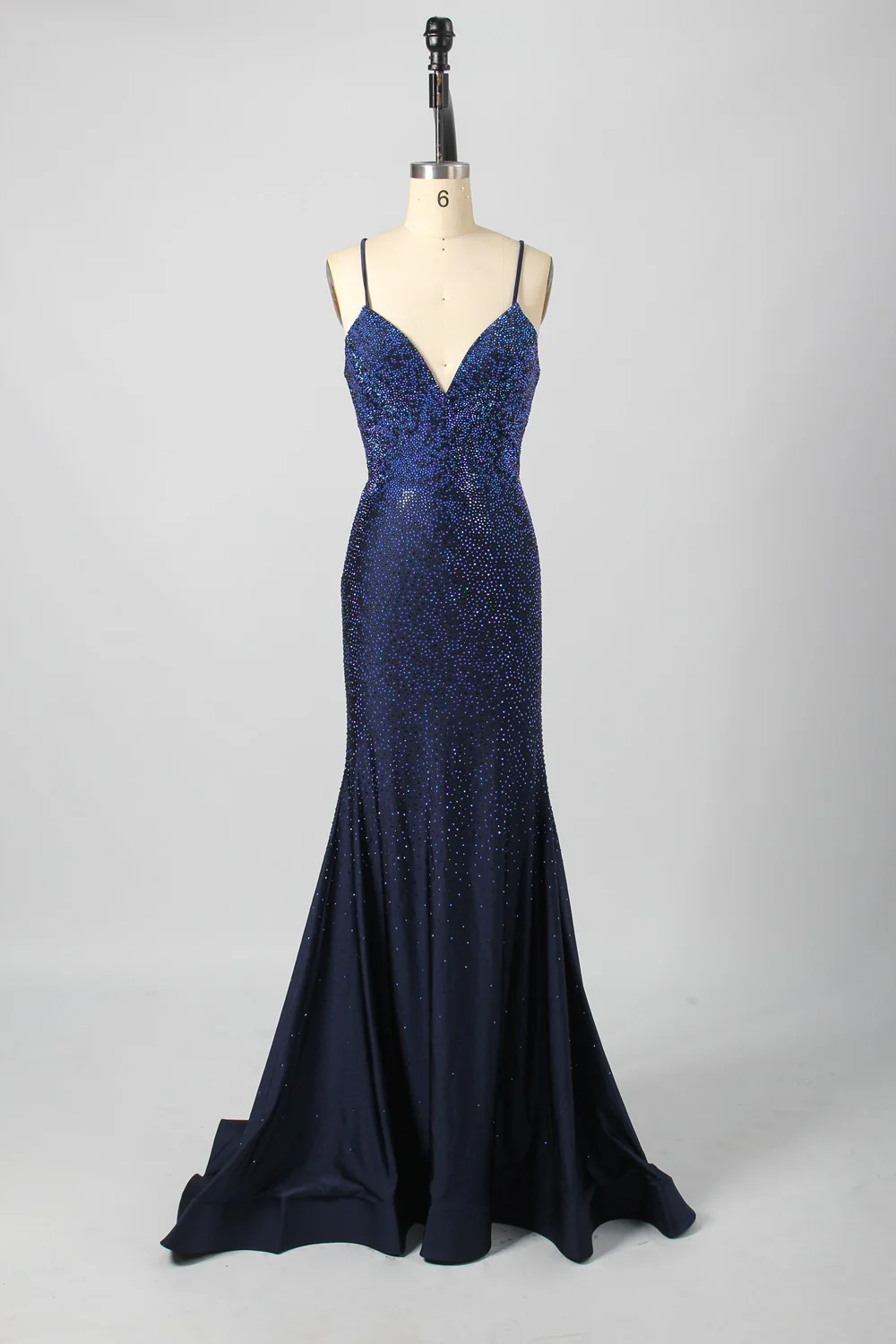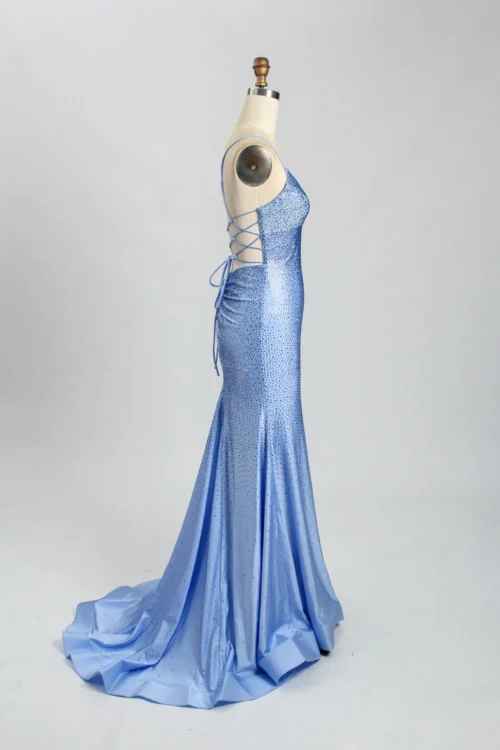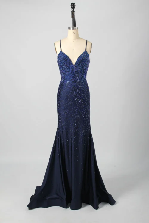 Sparkling mermaid fit gown with a low strappy back adorned with rhinestones