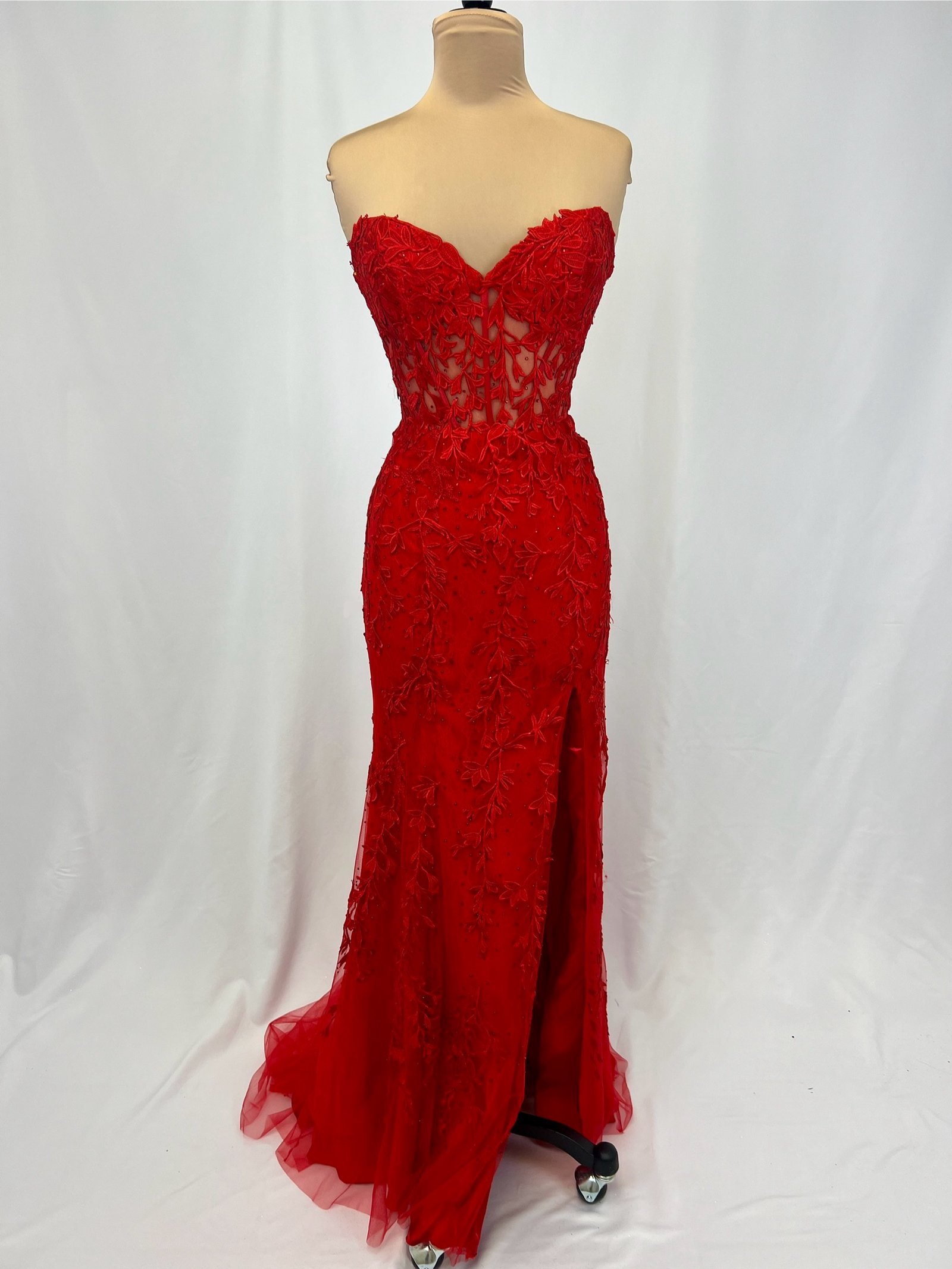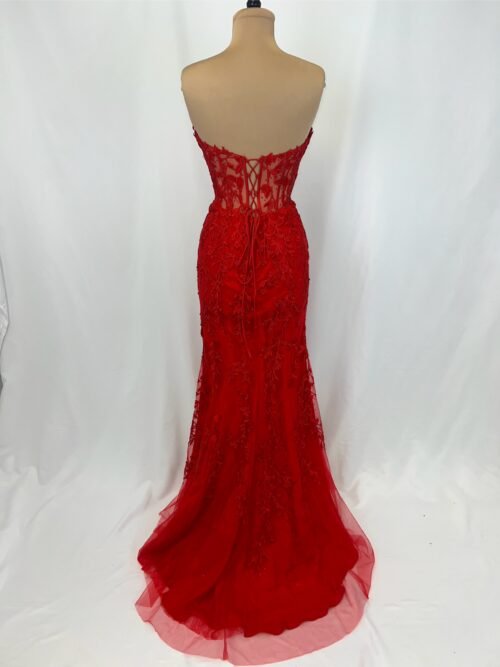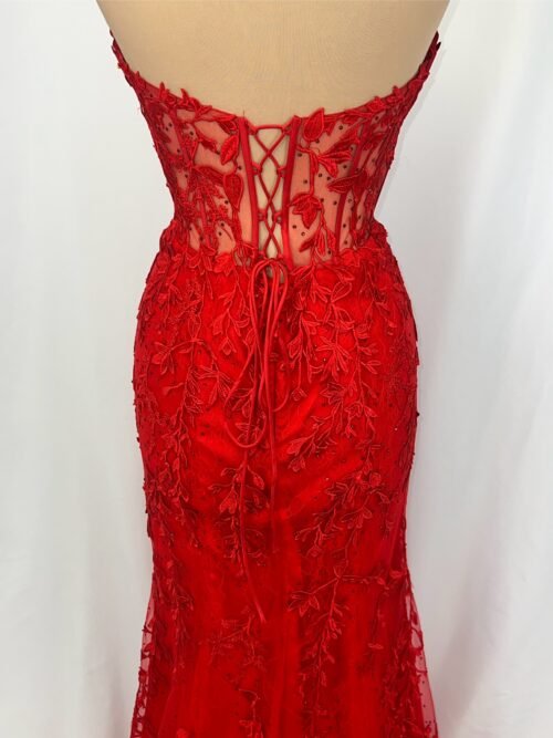 Stunning mermaid gown with romantic lace, a corset bodice, and a chic thigh-high slit.