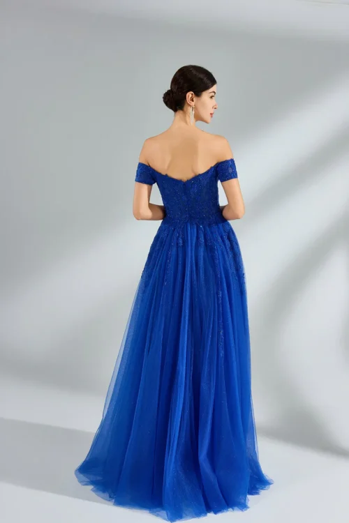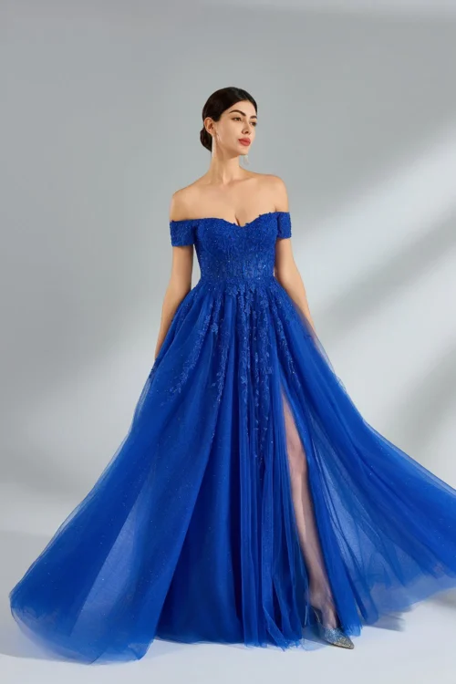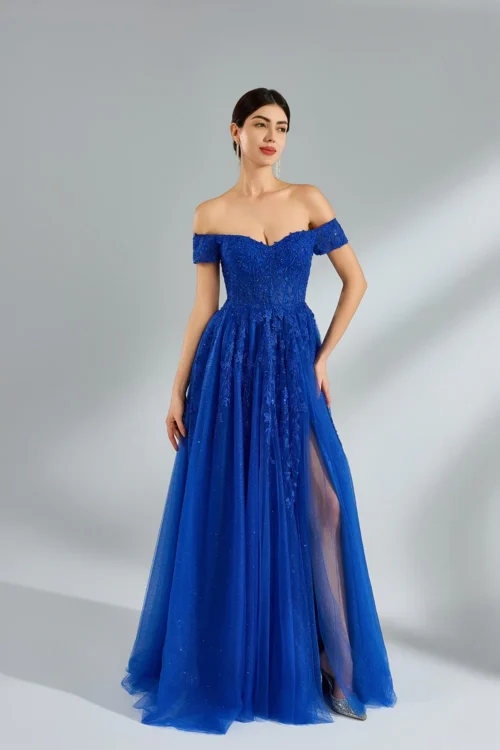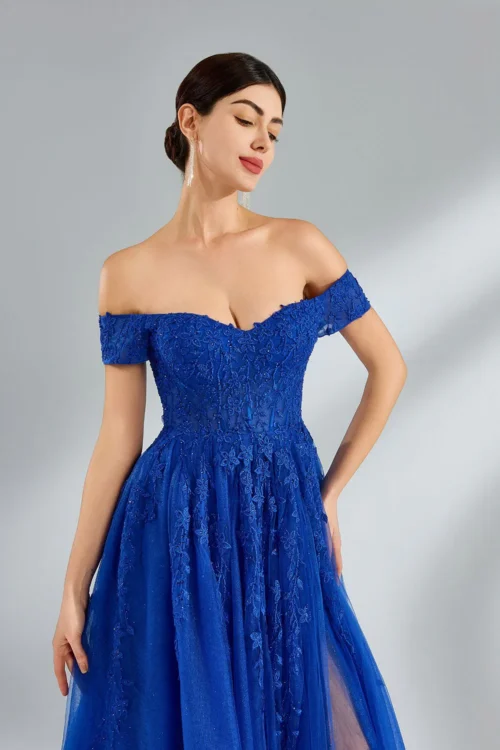 Off the shoulder lace corset bodice flows into a sparkle tulle a-line skirt with a slit