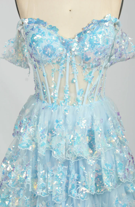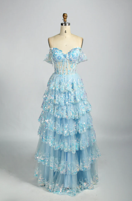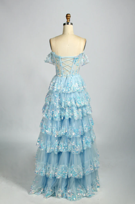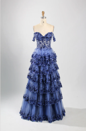 Whimsical off the shoulder tiered tulle gown with a lace corset bodice and scalloped lace finishing