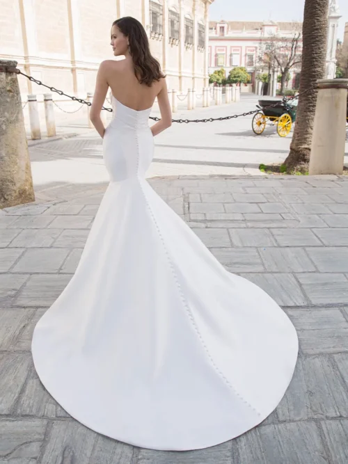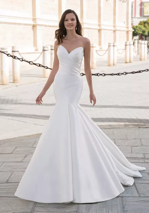 Minimalist bridal gown with a side draped sweetheart neckline bodice and a drop waist trumpet skirt