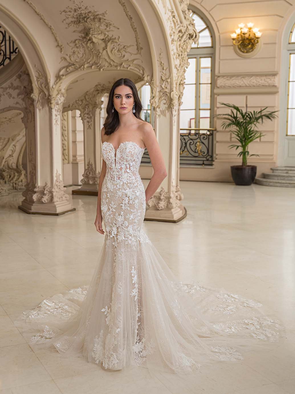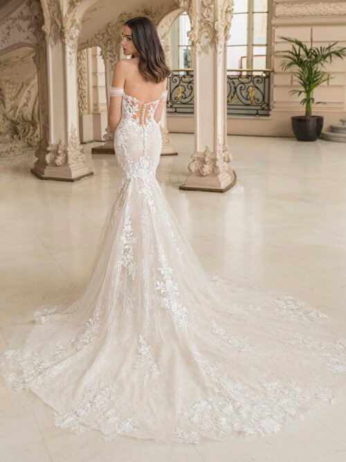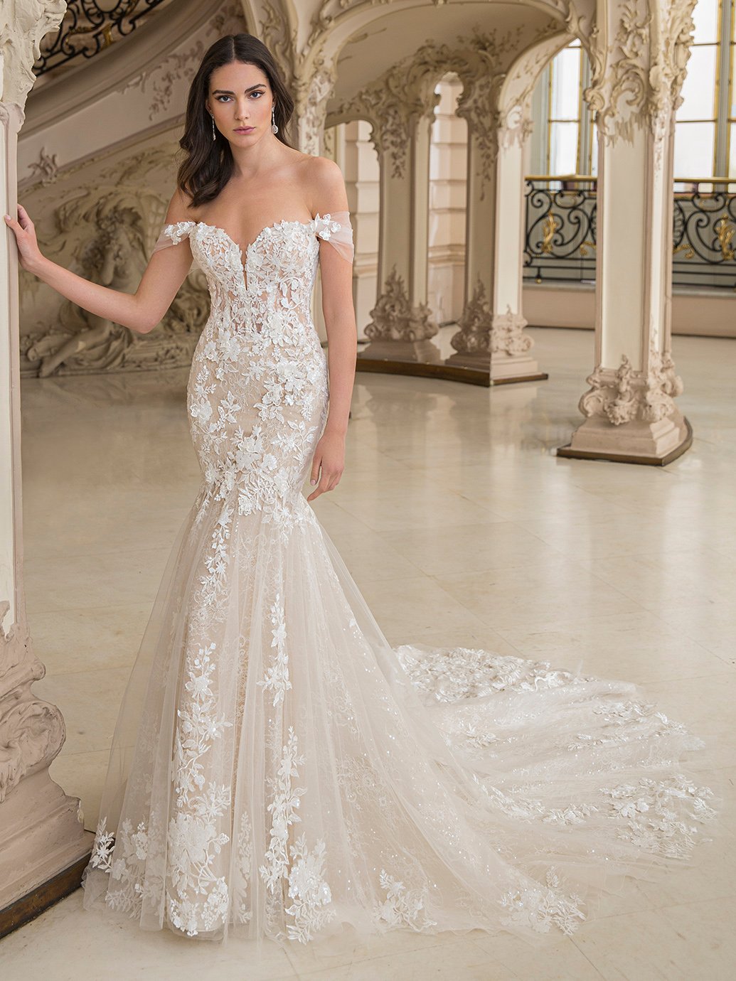 This gorgeous, multi-layered mermaid wedding bridal gown features ultra-romantic, detachable off-sho