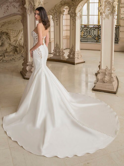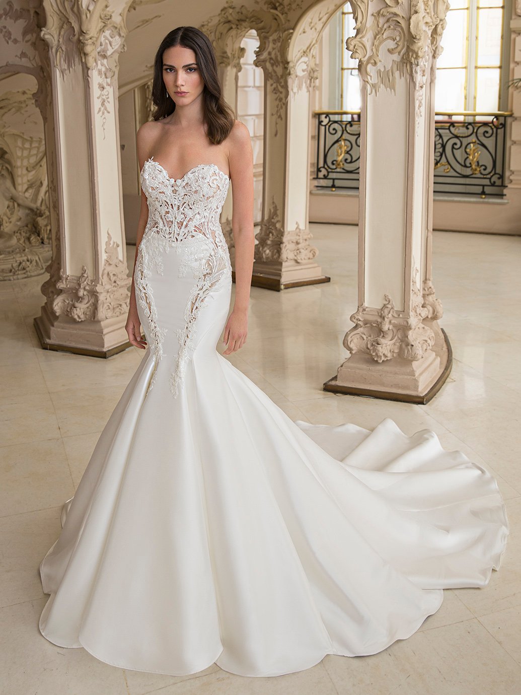 This sexy mikado mermaid gown has a blend of sparkling floral, baroque, and Chantilly lace accents