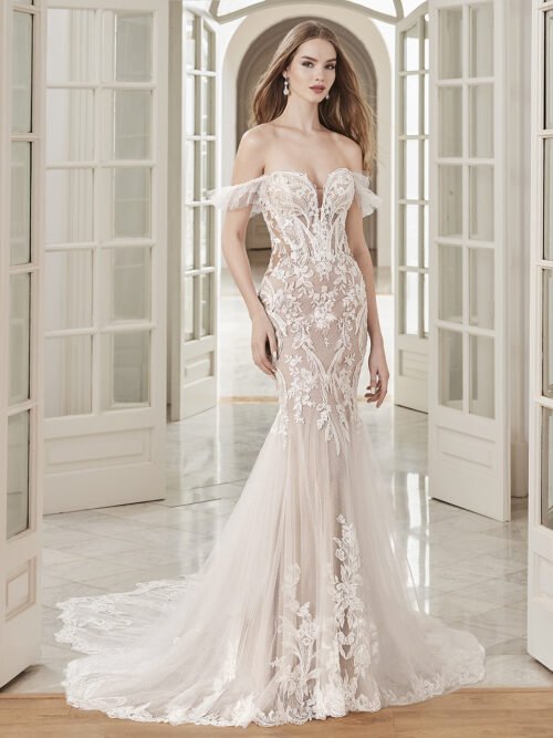 Mermaid style bridal gown with all over beaded baroque lace and detachable off the shoulder sleeves