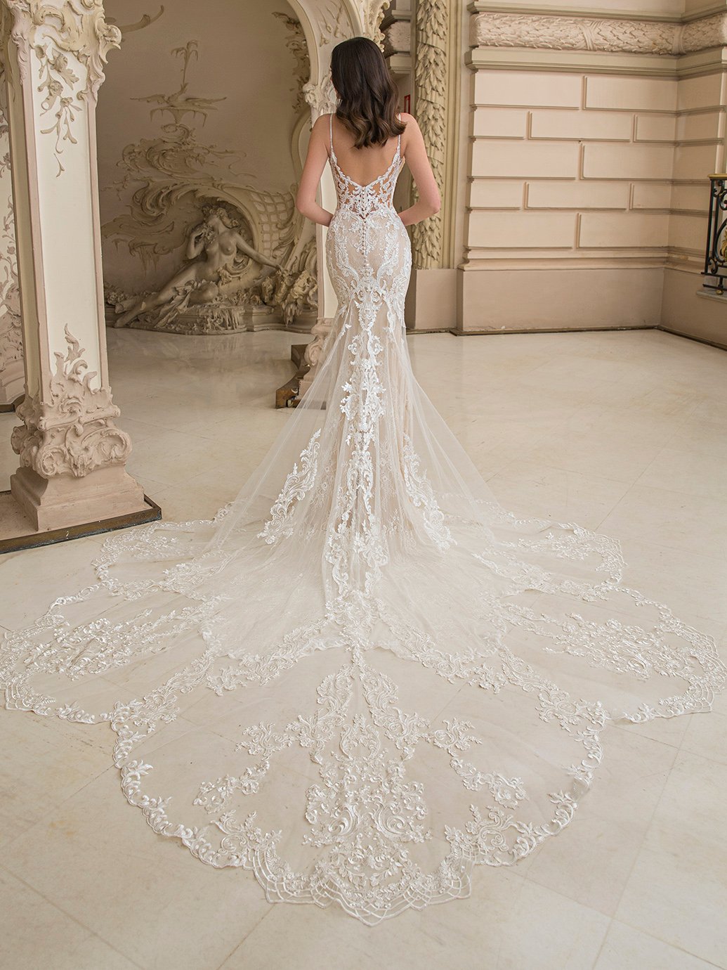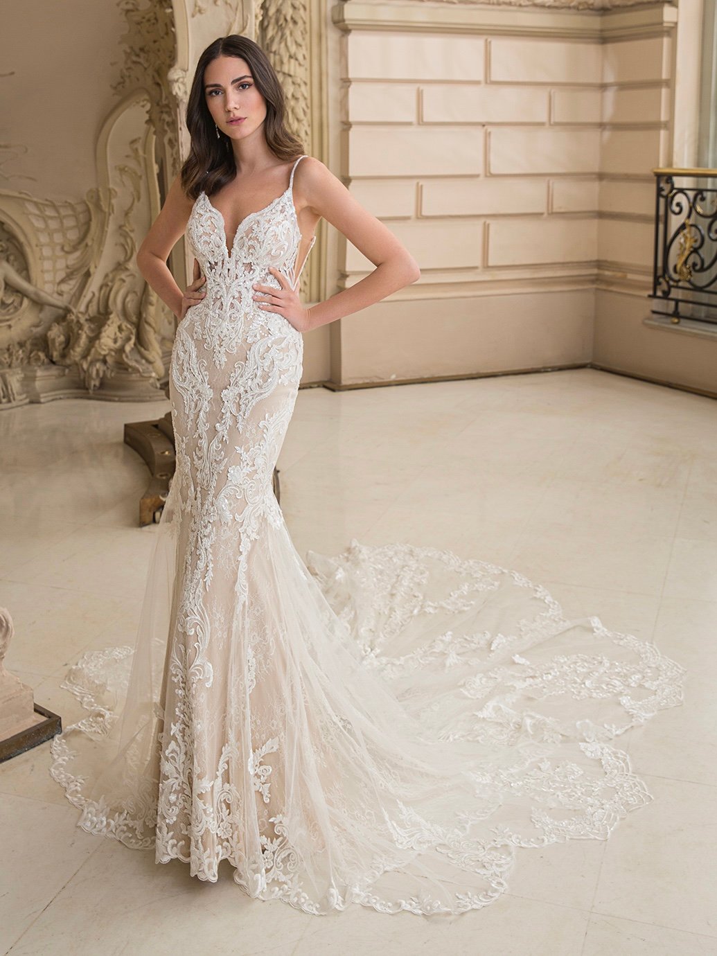 Deco-style lace along with sparkling Chantilly lace compliment the figure flattering mermaid gown