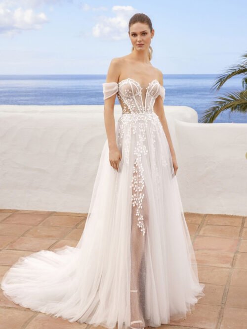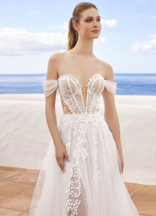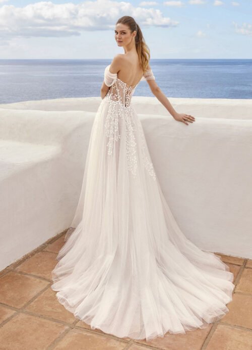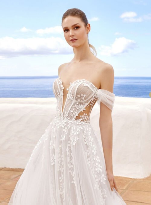 Whimsical off the shoulder corset style bodice with a sweetheart neckline and sparkle tulle skirt