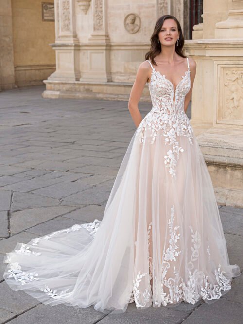 Delicate beaded straps compliment the plunging neckline on this airy romantic a-line gown