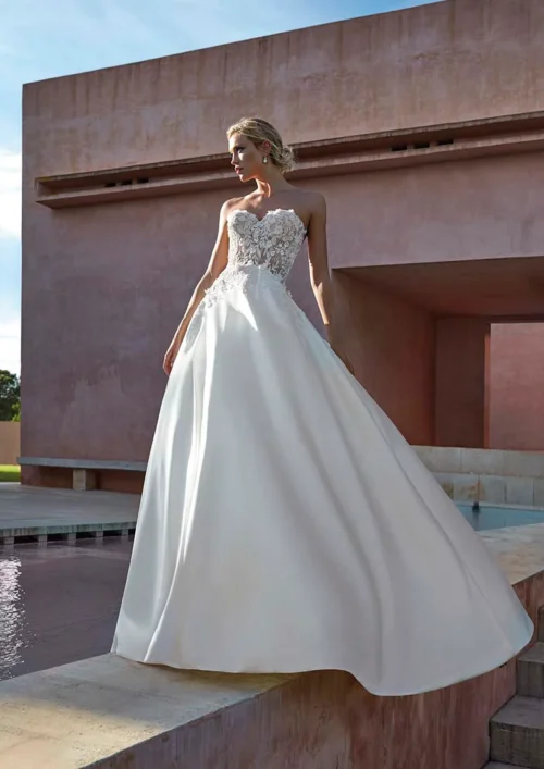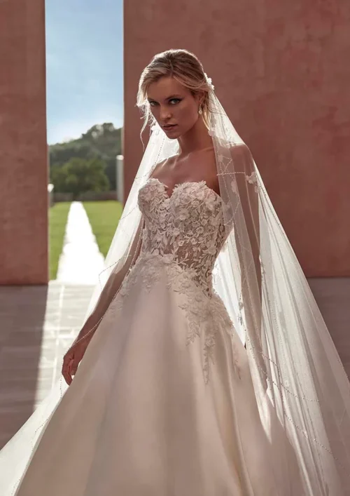 Sweetheart neckline ball gown with a 3D lace bodice and cutouts that trickle into the mikado skirt