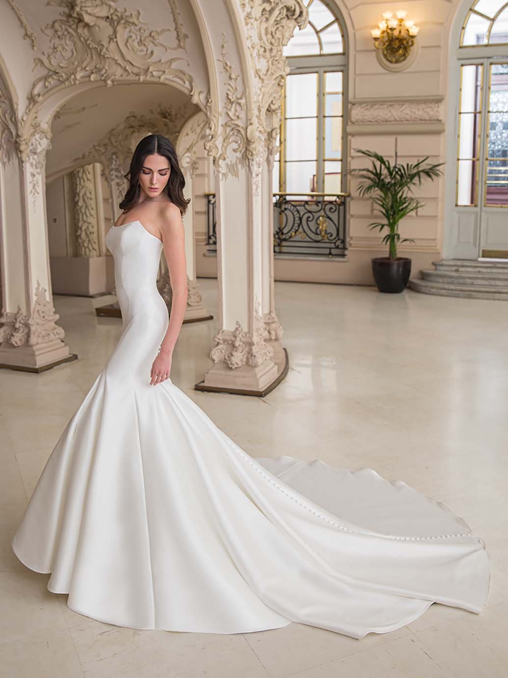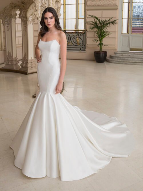 Timeless Mikado gown with a curved neckline and flattering, contoured seaming that hugs your curves