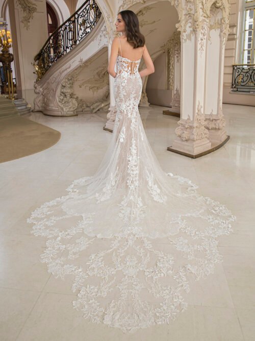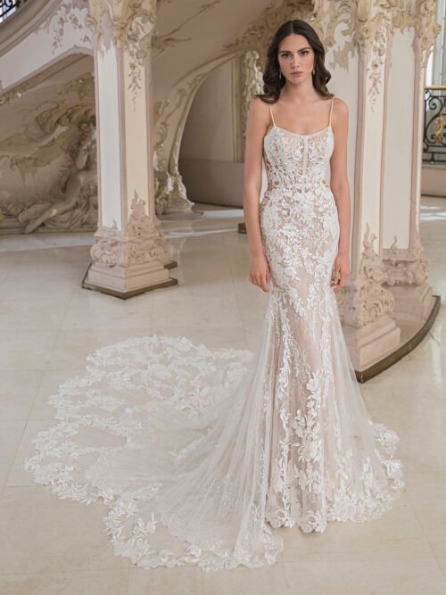 A modern scoop neckline with sparkling beaded straps, stunning fully beaded lace and lace embroidery