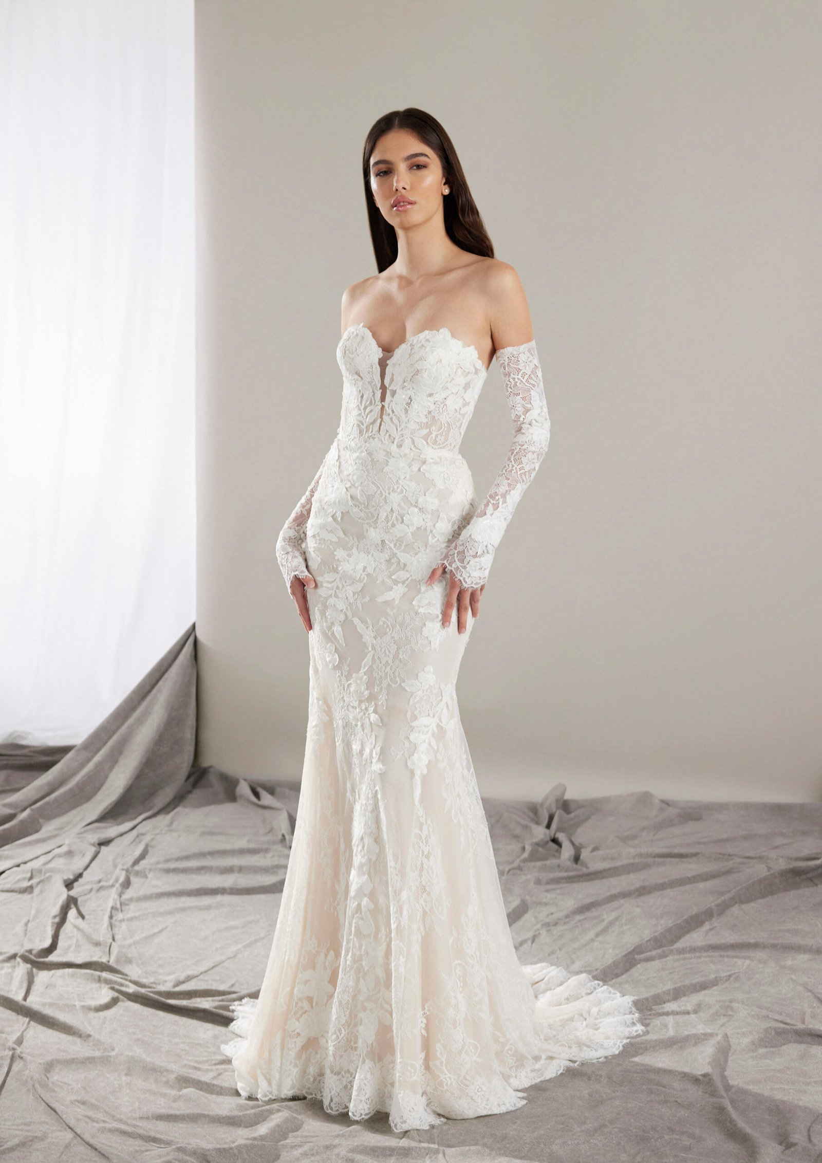 Romantic all over lace bridal gown with detached off the shoulder fitted sleeves and a corset back