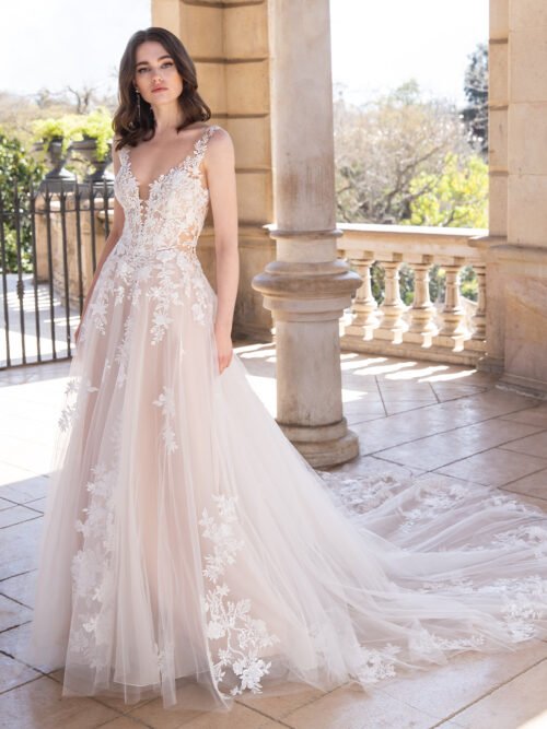 A soft A-line gown with sparkling floral lace, hand-beading at the neckline and a contoured bodice