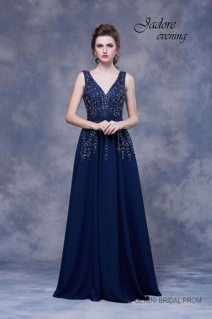 Soft a-line gown with fully beaded bodice and beading cascading into the chiffon skirt