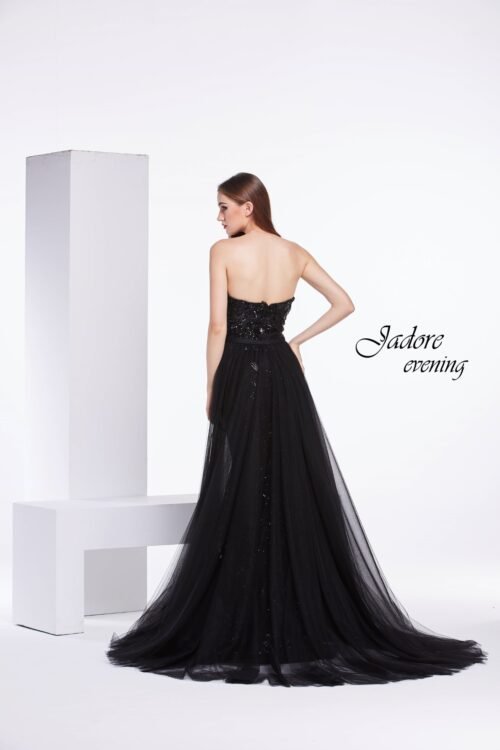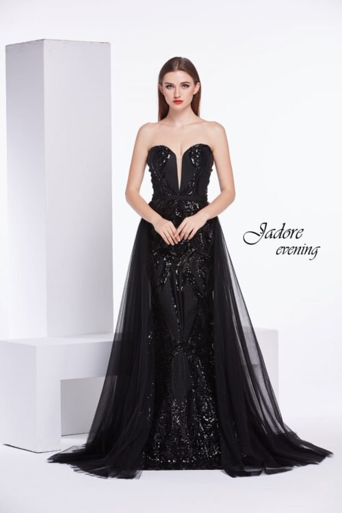 Fitted sweetheart neckline full sequin gown with detachable tulle overskirt