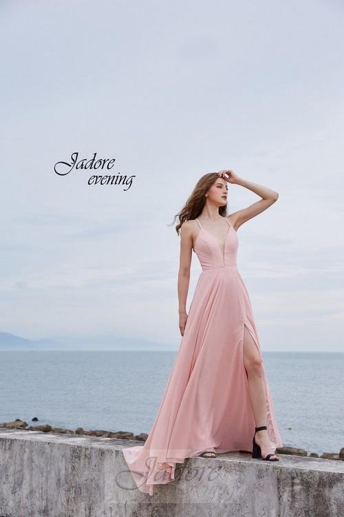 Soft sparkle chiffon a-line gown with a plunging neckline and open corset back