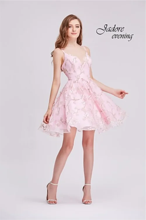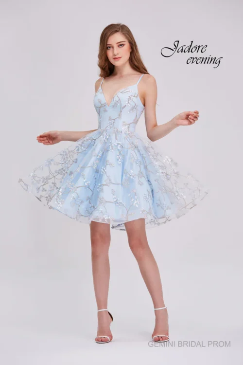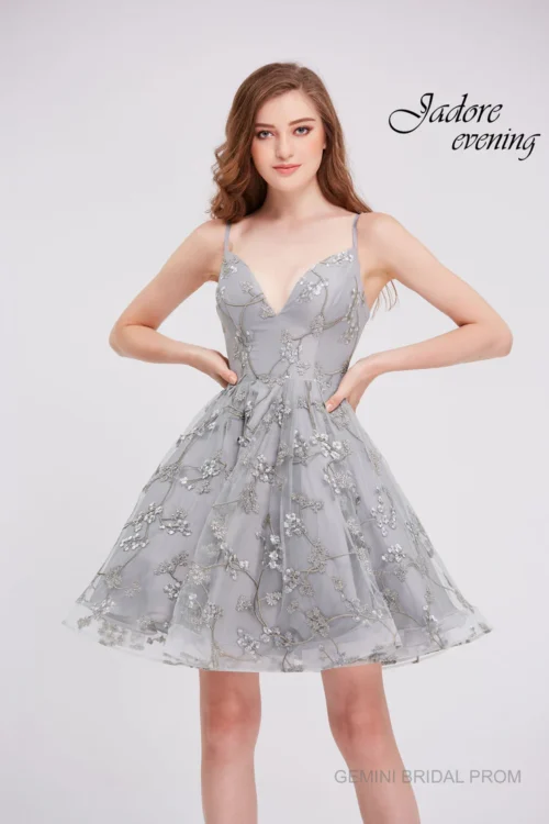 Floral lace grade 8 grad dress with spaghetti straps and a corset back