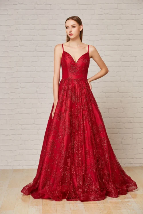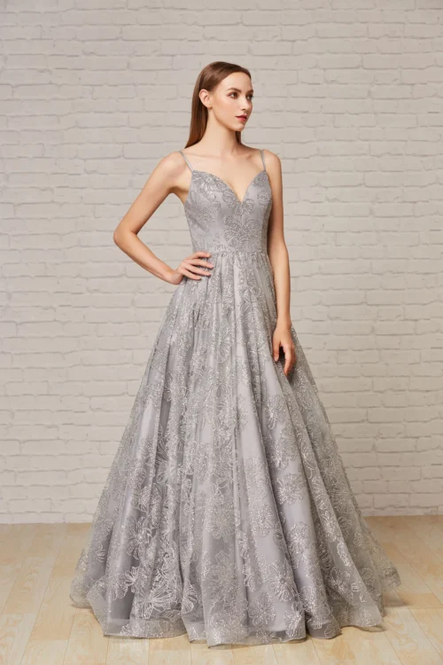 Extravagant ballgown with spaghetti straps, a corset back and all over sparkling floral print
