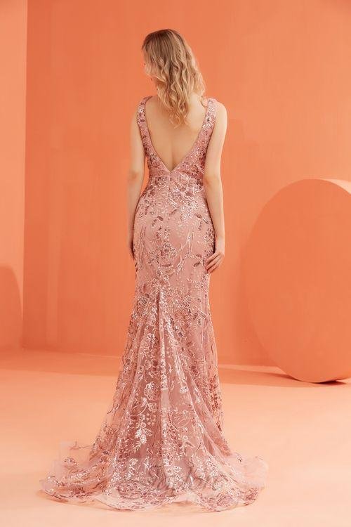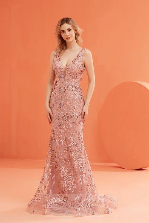 Mermaid all over sequin lace gown with wide straps and a plunging neckline