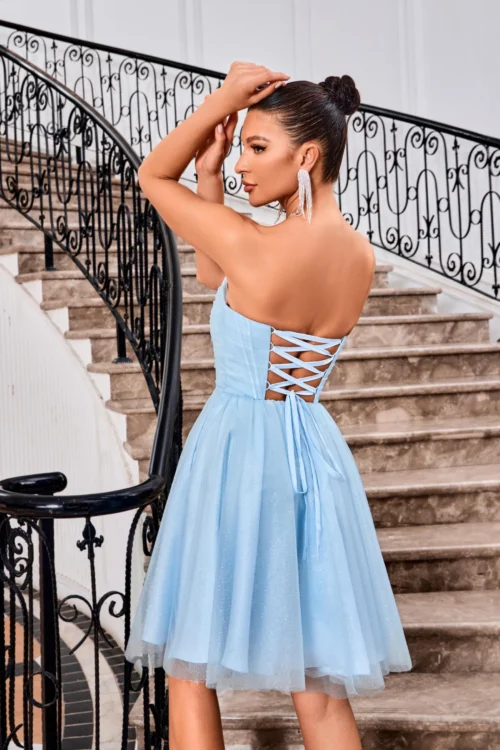 Sparkle tulle a-line grade 8 grad dress with a structured scoop neck corset bodice and pockets