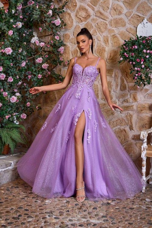Sweetheart neckline bustier style corset bodice with a soft a-line sparkle tulle skirt with a slit