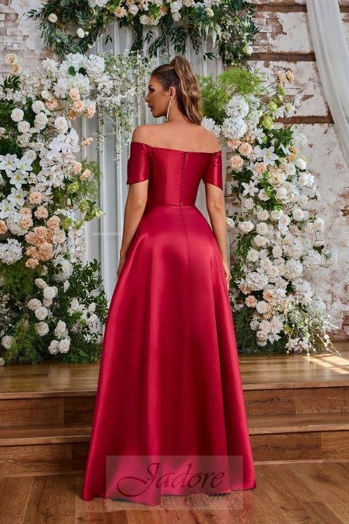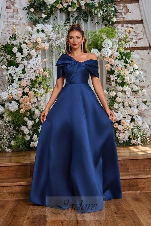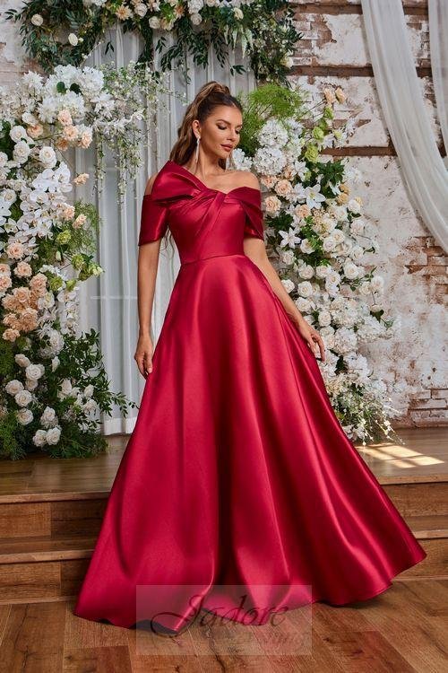 Mikado a-line gown with an asymmetrical bow detail on the front neckline and off the shoulder sleeve