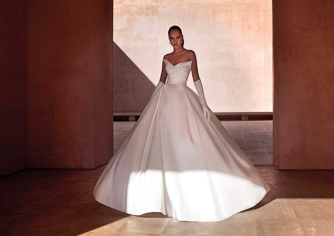 Timeless mikado strapless ballgown with dramatic peaks accenting the sweetheart neckline