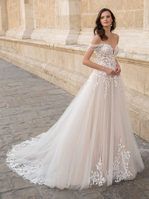 Stunning sparkling floral lace on a classic sweetheart neckline bodice that cascades into the skirt