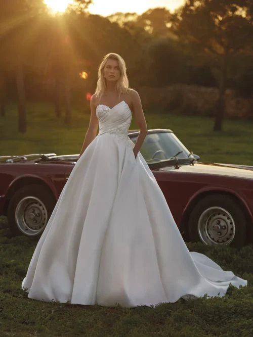 Dramatic mikado ballgown wedding dress with an asymmetrical beaded and ruched bodice with a tail