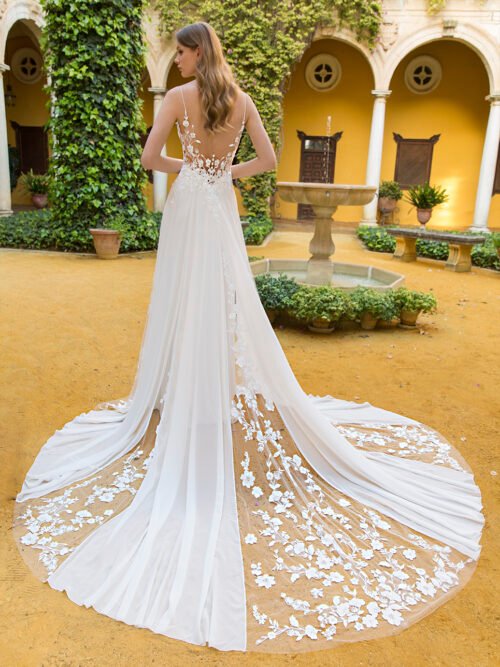 Feminine and sweet, this floaty, soft A-line gown is complete with layers of sheer chiffon skirt, a