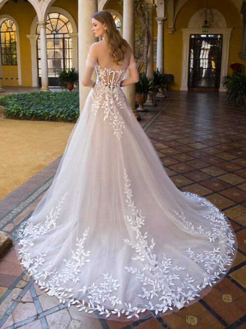 Simply sweet and divine, this stunning A-line gown is sure to captivate with the custom-made, vine-l