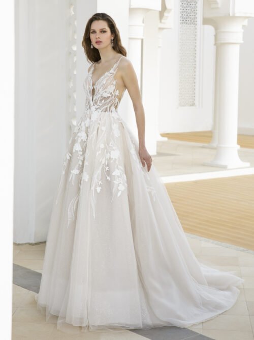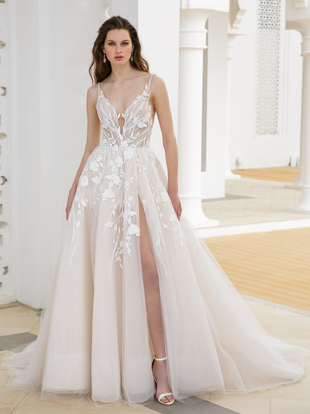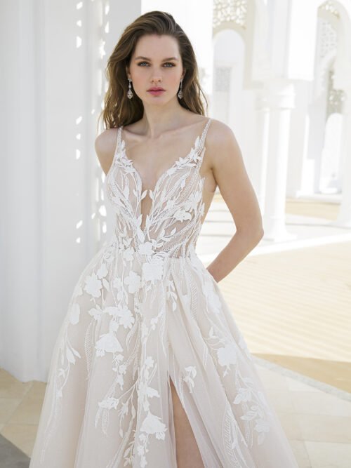 This A-line beauty has got us lovestruck! From the exquisite beaded botanical lace to the lovely gli
