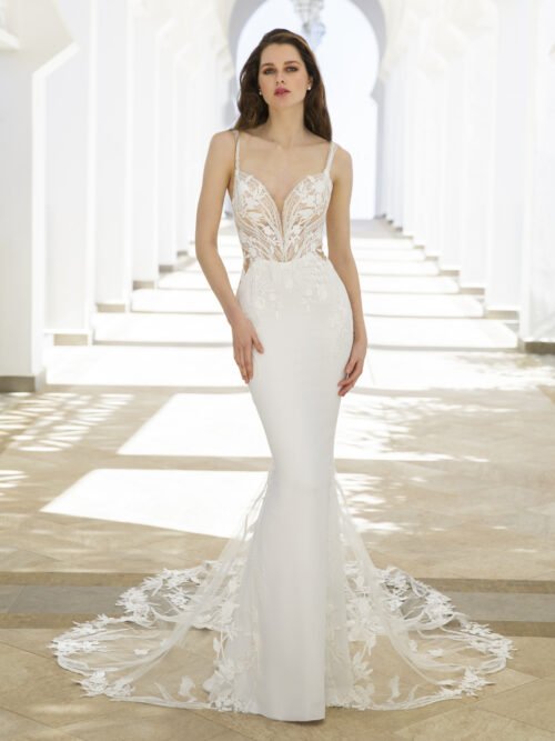 An oh-so effortless yet glamorous bridal look, sleek crepe adorned with beaded appliqués