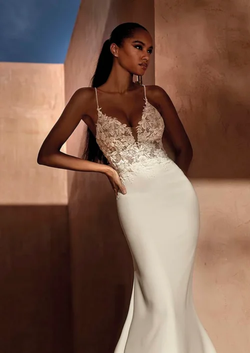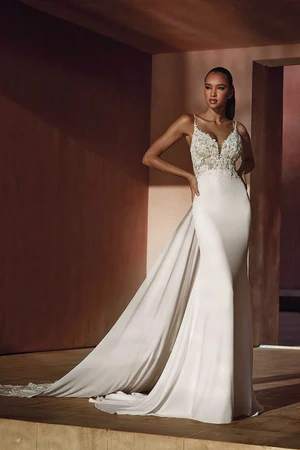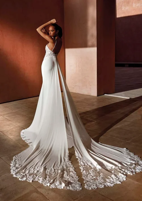 Ethereal fitted crepe wedding dress with a romantic lace bodice and chiffon tail