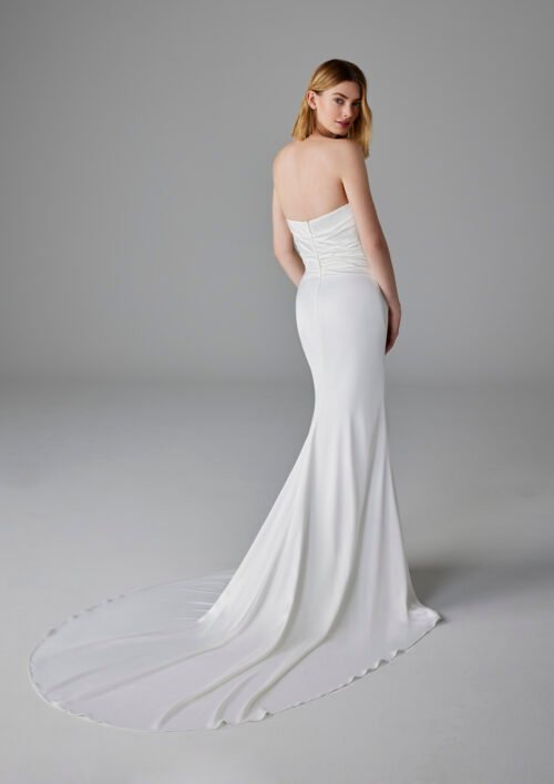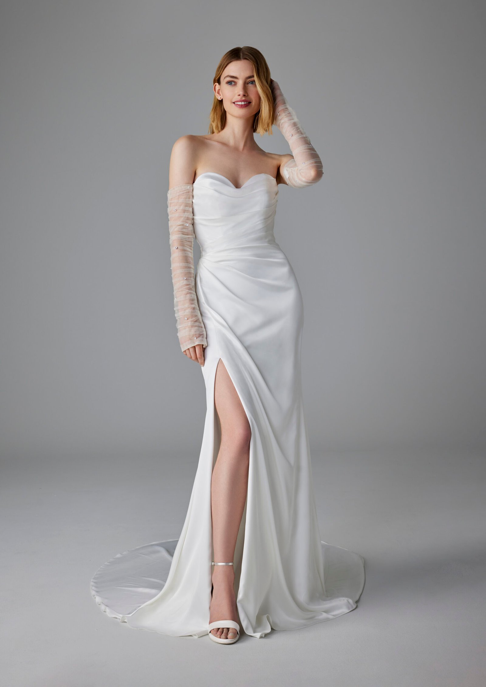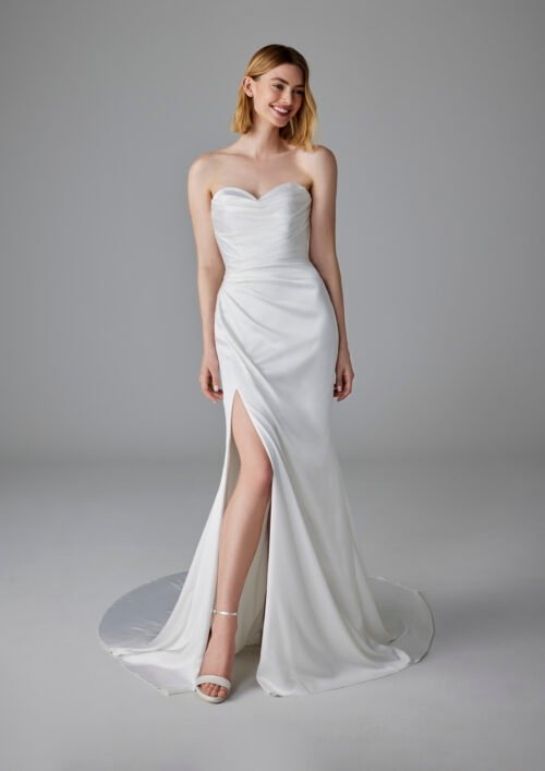 Timeless sheath satin wedding gown with elegant rouching that hits you in all the right places