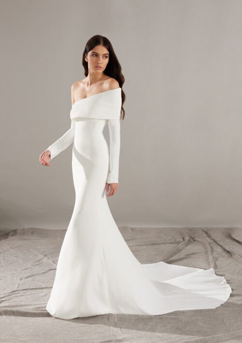 An alluring asymmetrical fitted crepe bridal gown with detachable off the shoulder fitted sleeves