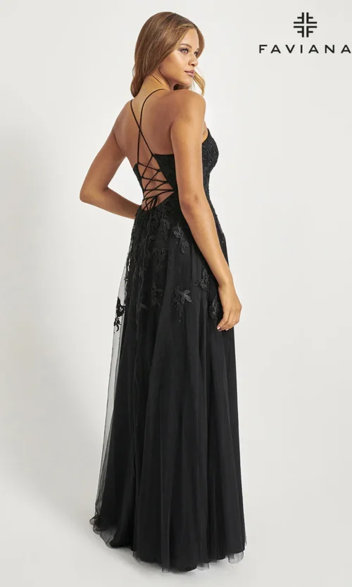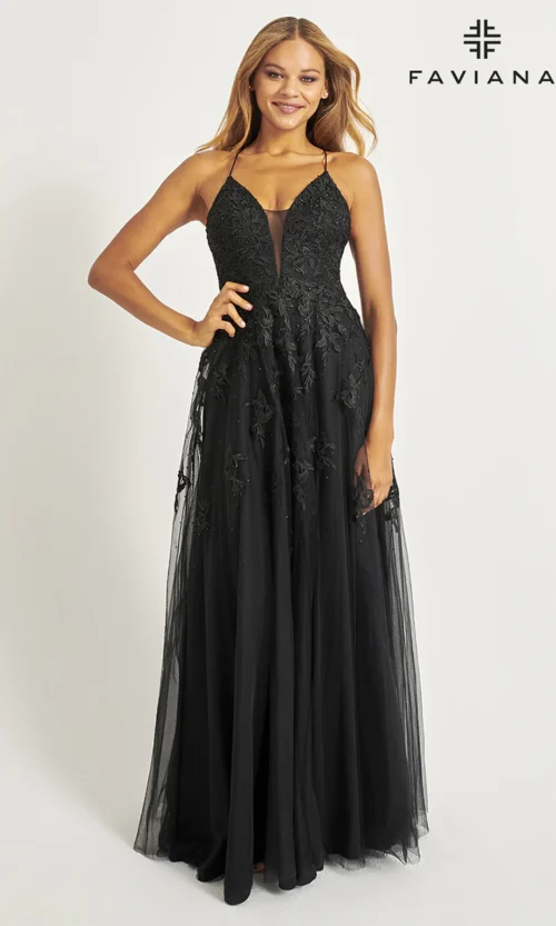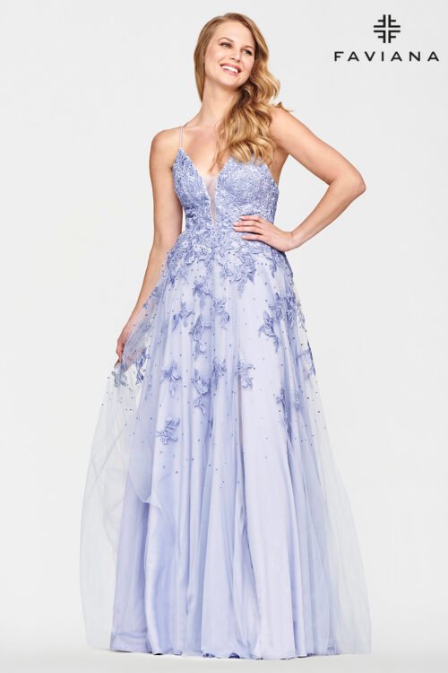 Soft a-line tulle and lace gown with a plunging neckline, skirt slit and open corset back